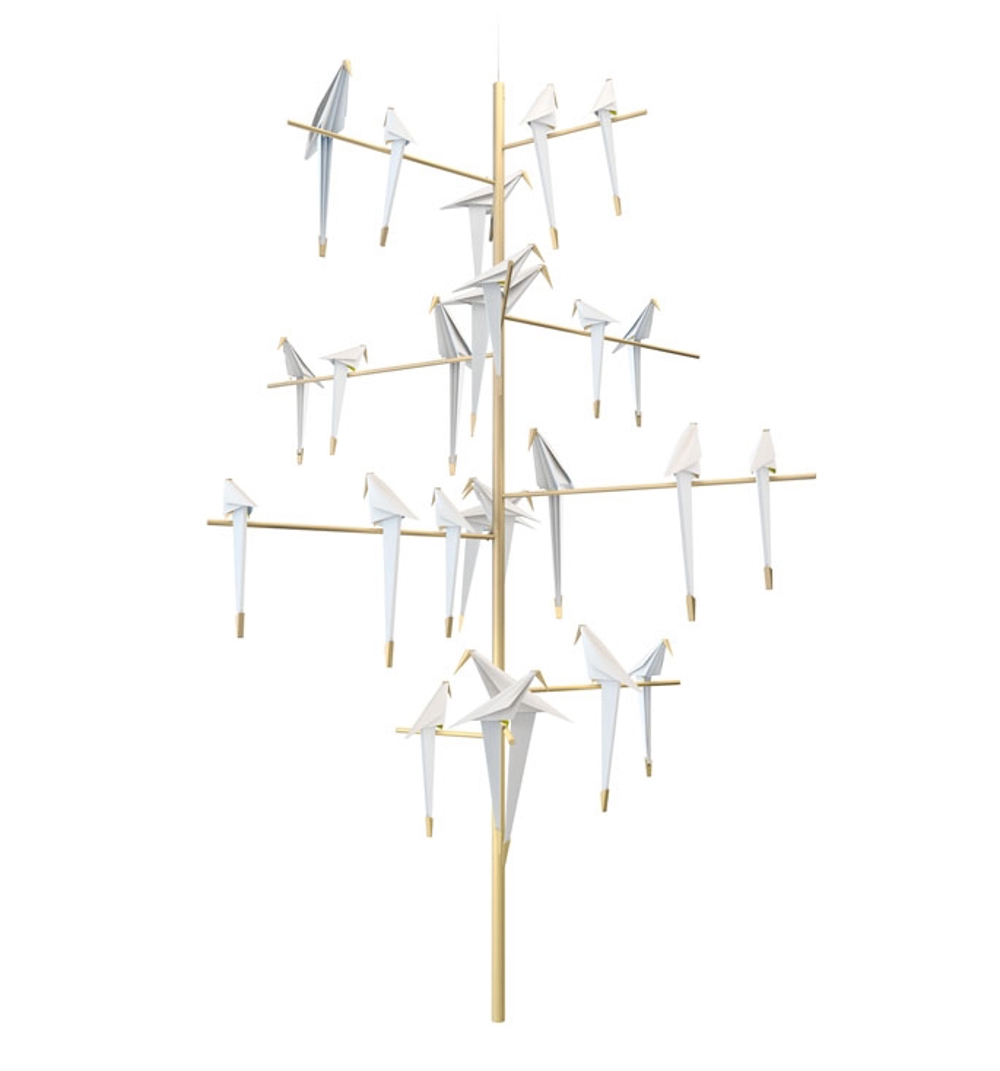 Perch Light Tree składa się z 25 abstrakcyjnych ptaków rozmieszczonych na gałęziach, które nadają wnętrzu wyjątkowy blask i nastrój. Gdy delikatnie dotkniesz ptaków, mogą się kołysać, co dodaje im jeszcze więcej życia