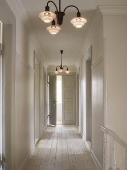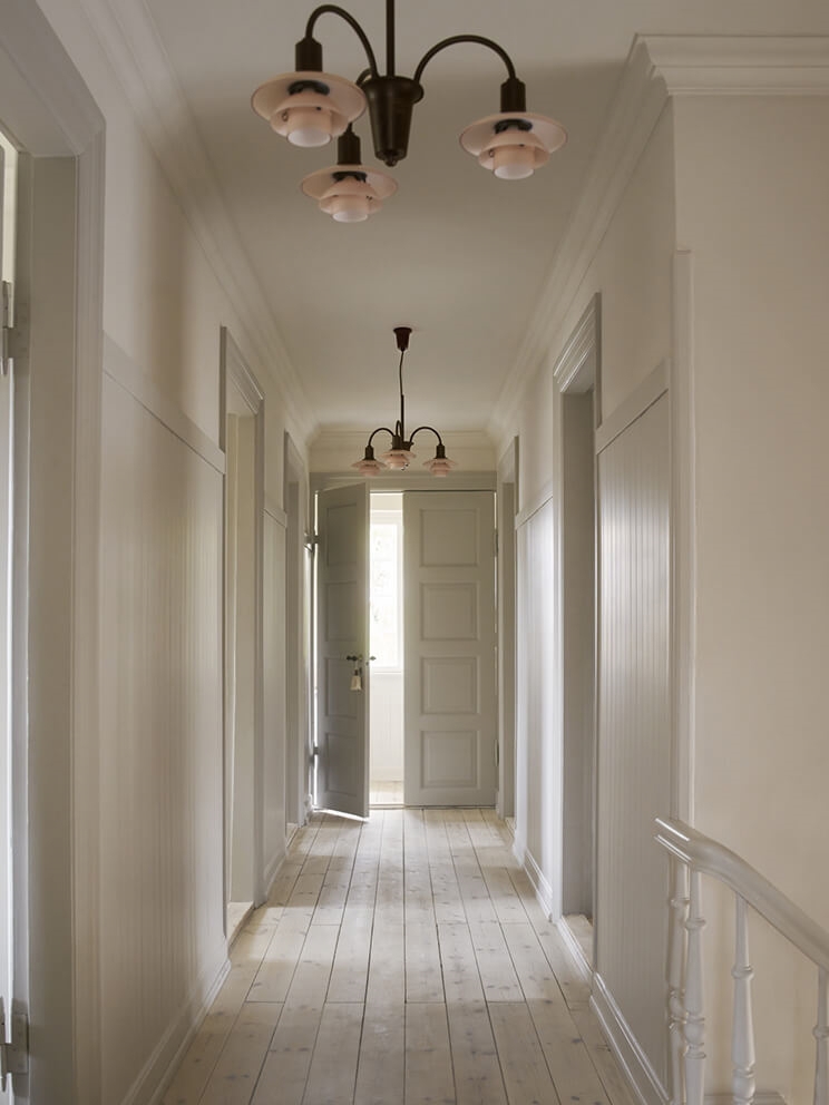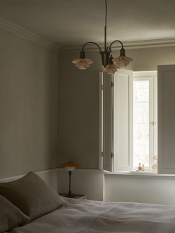 Ta Centenary Edition lampy w lakierowanym aged brass z kloszami ze szkła w kolorze dusty terracotta została wprowadzona w 2026 roku, aby uczcić 100-lecie trójkloszowego systemu Poul Henningsena z 1926 roku. System - znany również jako System PH - składa się z trzech kloszy, które można łączyć w wiele różnych lamp i zapewniają całkowicie nieoślepiający rozkład światła.