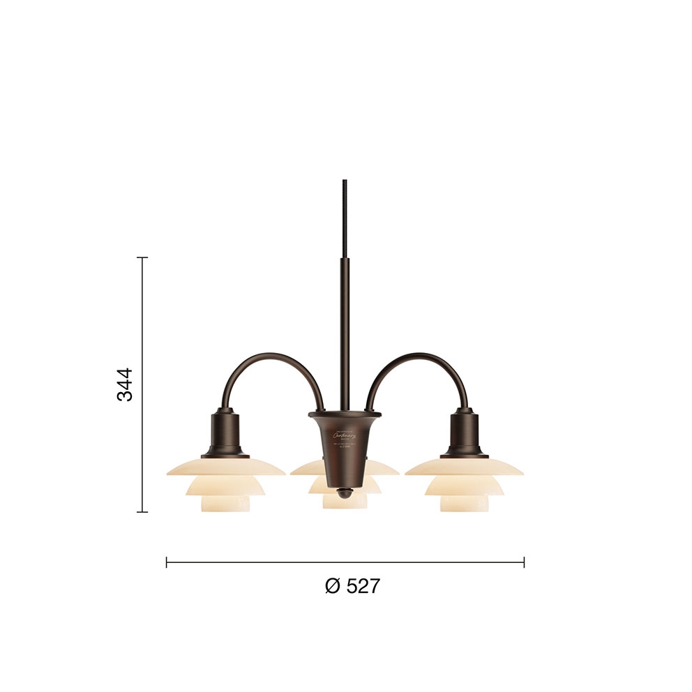 Wyjątkowy 3-ramienny Centenary Edition żyrandol PH 1/1 to wariant Limited Edition kultowego żyrandola Bombardement zaprojektowanego przez Poul Henningsen. Żyrandol po raz pierwszy pokazano w katalogu Louis Poulsen w 1933 roku i na przestrzeni lat był dostępny w różnych wersjach.