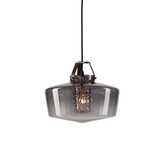 Addicted To Us od Design By Us to elegancka lampa wisząca z dmuchanego szkła, zakończona skórą w kolorze koniaku na górze.