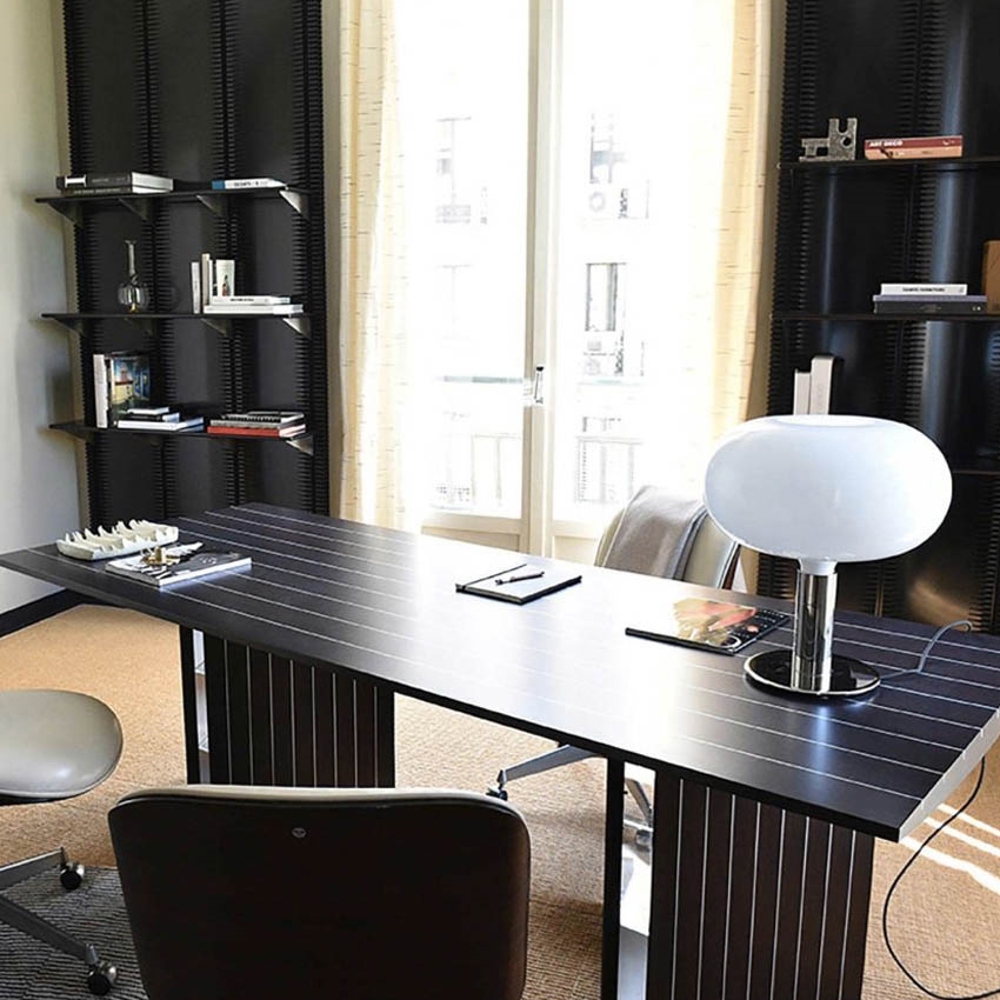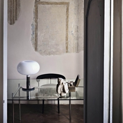 Lampa stołowa AM1N ma minimalistyczny design z chromowaną podstawą i kloszem z białego opalowego szkła.