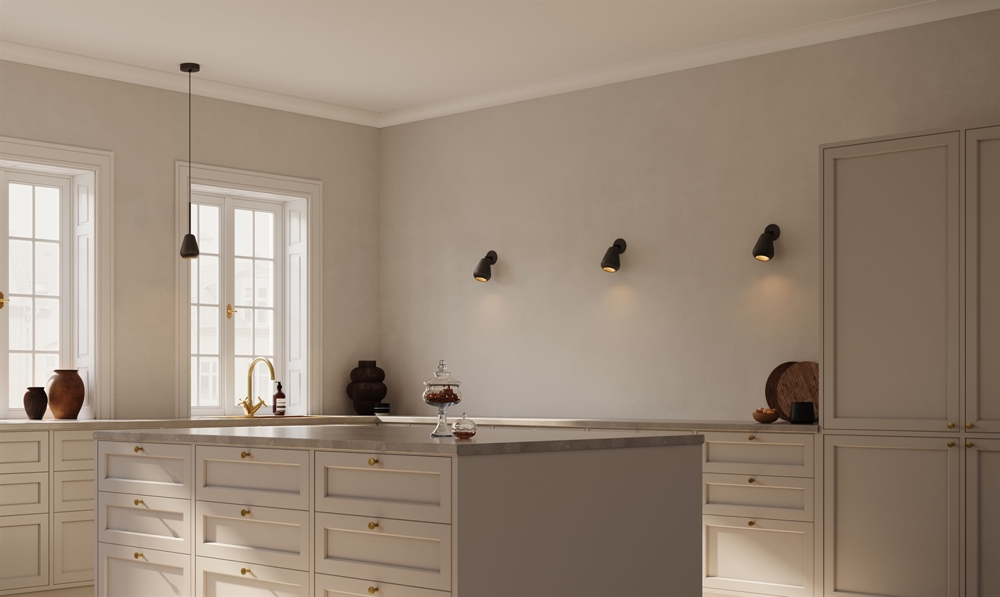 Anoli Spot Surface do montażu na suficie lub ścianie jest idealny jako lampa sufitowa lub kinkiet w pomieszczeniach wymagających wysokiej jakości oświetlenia punktowego. Metalowy klosz nawiązuje do formy kropli deszczu i jest umieszczony na regulowanym ramieniu, dzięki czemu można skierować nieoślepiające światło robocze. Użyj Anoli Spot w kuchni lub w innym pomieszczeniu wymagającym dobrego oświetlenia punktowego.