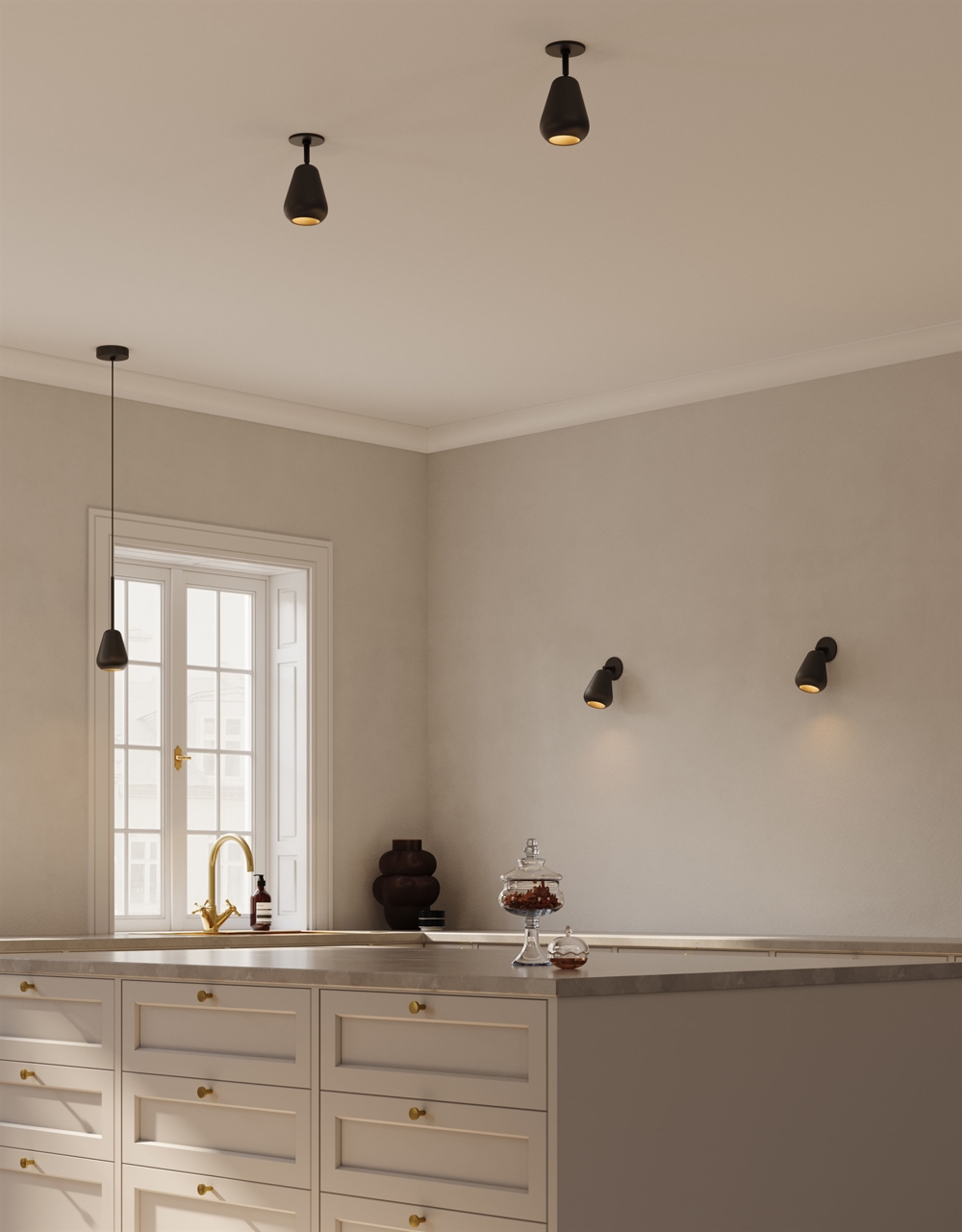Anoli Spot Recessed do zabudowy w suficie lub ścianie jest idealny jako lampa sufitowa lub kinkiet w pomieszczeniach wymagających wysokiej jakości oświetlenia punktowego. Metalowy klosz nawiązuje do formy kropli deszczu i jest umieszczony na regulowanym ramieniu, dzięki czemu można skierować nieoślepiające światło robocze. Użyj Anoli Spot w kuchni lub w innym pomieszczeniu wymagającym dobrego oświetlenia punktowego.