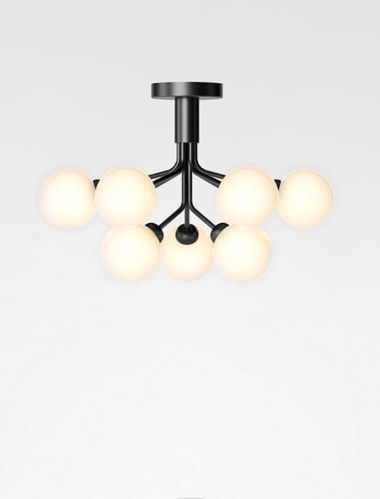 Apiales 9 lampa sufitowa montowana jest bezpośrednio do sufitu i ma niską wysokość 40 cm. To daje lampie dużą wszechstronność - i teraz możliwe jest posiadanie lampy sufitowej/żyrandola, gdzie sufit jest niski lub w przejściach.