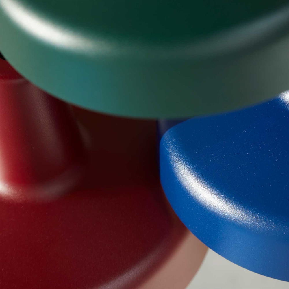 Lampy Arigato składają się z korpusu z rur stalowych oraz aluminiowego klosza. Powierzchnia była wcześniej dostępna tylko w matowej czerni lub bieli z powłoką proszkową - ale teraz dostępne są również warianty w kolorze niebieskim, czerwonym i zielonym.