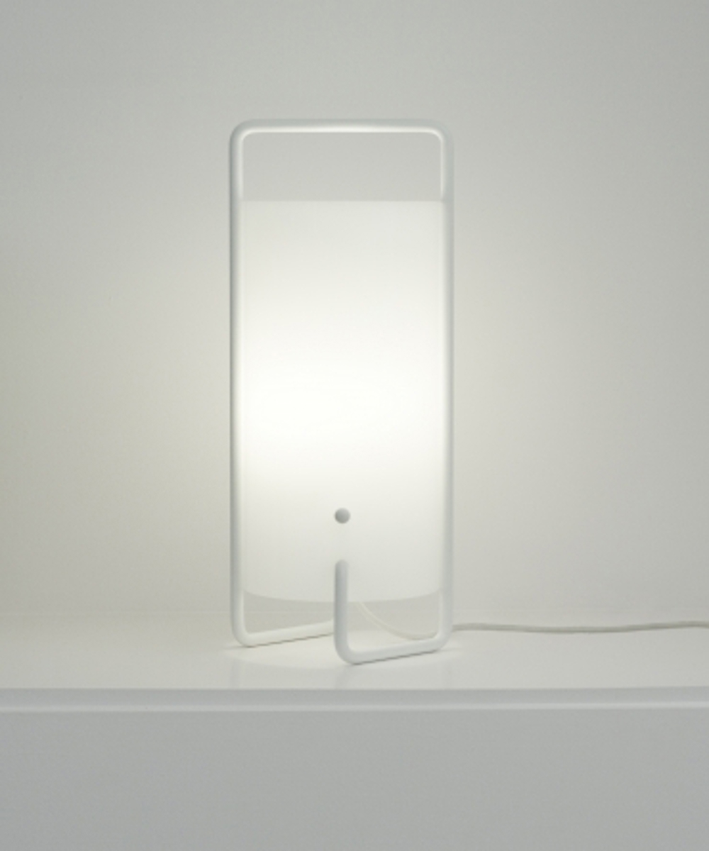 Lampa stołowa wykonana jest z metakrylanu, przez który światło może przenikać. Ponadto lampa stołowa ma białą metalową krawędź z matowym wykończeniem.