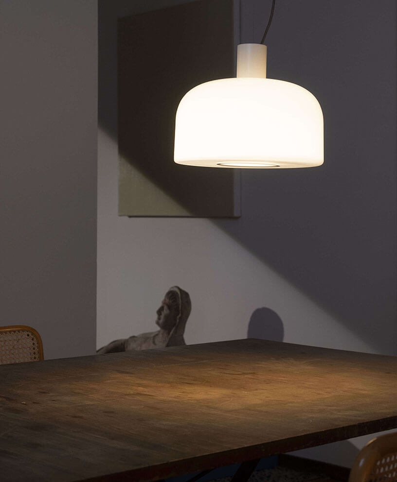 Bellhop Glas lampa wisząca występuje w dwóch rozmiarach i oprócz białej góry, także z górą w kolorach cioko lub jasnego aluminium. W serii lamp dostępne są również lampa sufitowa i stołowa.