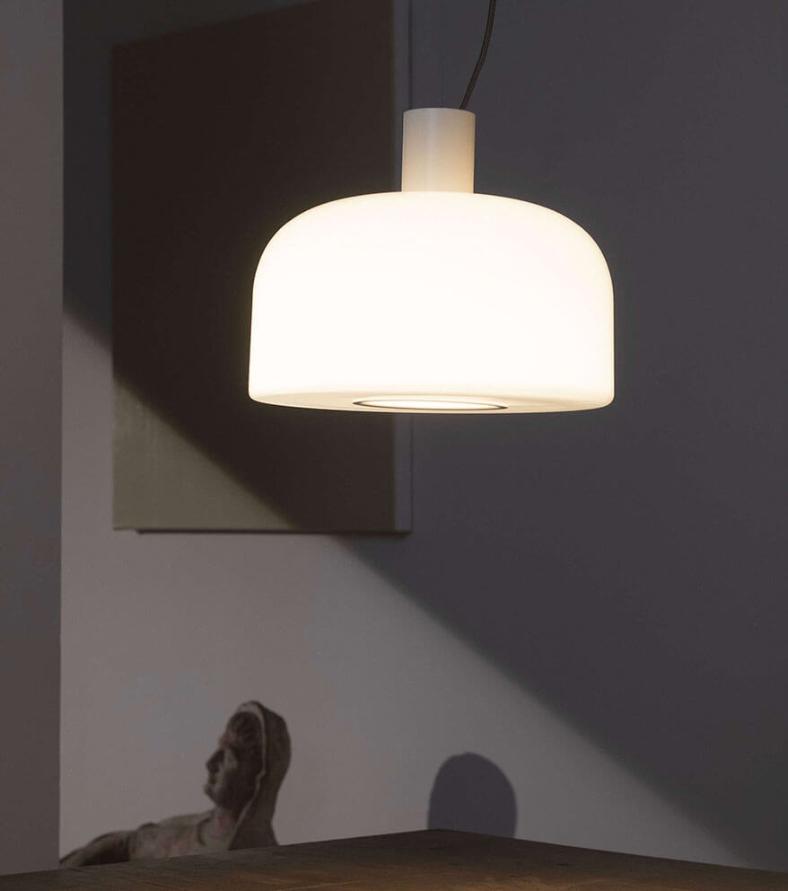 Bellhop Glas lampa wisząca występuje w dwóch rozmiarach i oprócz białej góry, także z górą w kolorach cioko lub jasne aluminium. W serii lamp znajduje się również lampa sufitowa i stołowa.