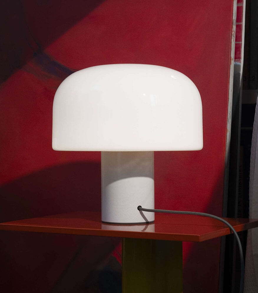 Bellhop Glas lampa stołowa dostępna jest oprócz białej podstawy również z podstawą w kolorach cioko lub jasne aluminium. W serii lamp znajdują się również lampa wisząca i sufitowa.