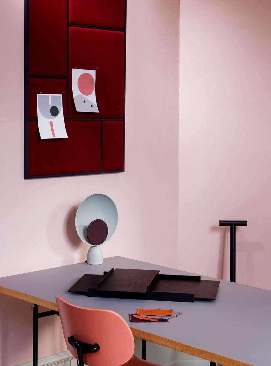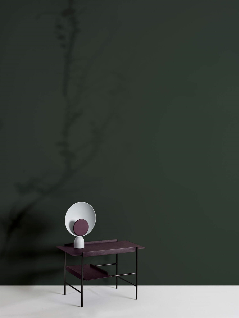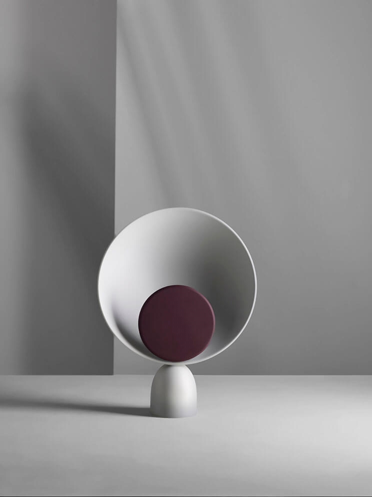 Lampa stołowa Blooper delikatnie odbija światło od pustej popielatej szarej tarczy, która otacza charakterystyczną mniejszą tarczę ściemniacza w kolorze fioletowym. Mała tarcza działa zarówno jako włącznik, jak i ściemniacz, gdy jest obracana w celu włączenia lub wyłączenia lampy lub dostosowania jej jasności.