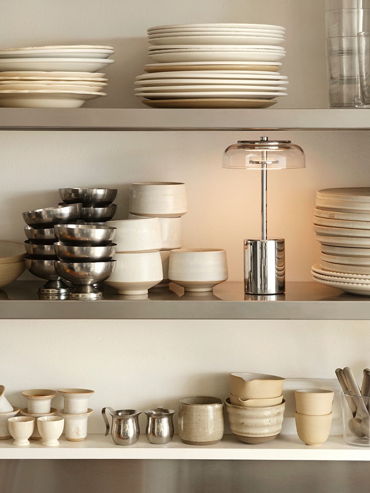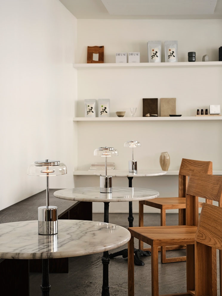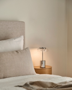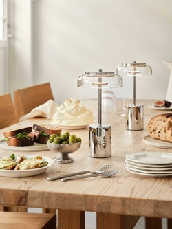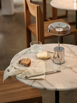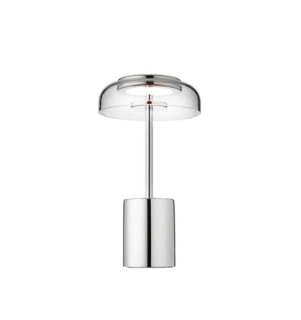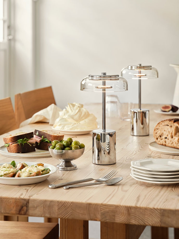 Nuura Blossi Mini Portable lampa stołowa/lampa bateryjna, chrom/przezroczysta - zaprojektowana przez Sofie Refer