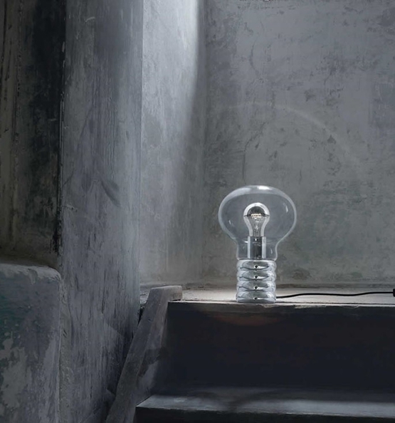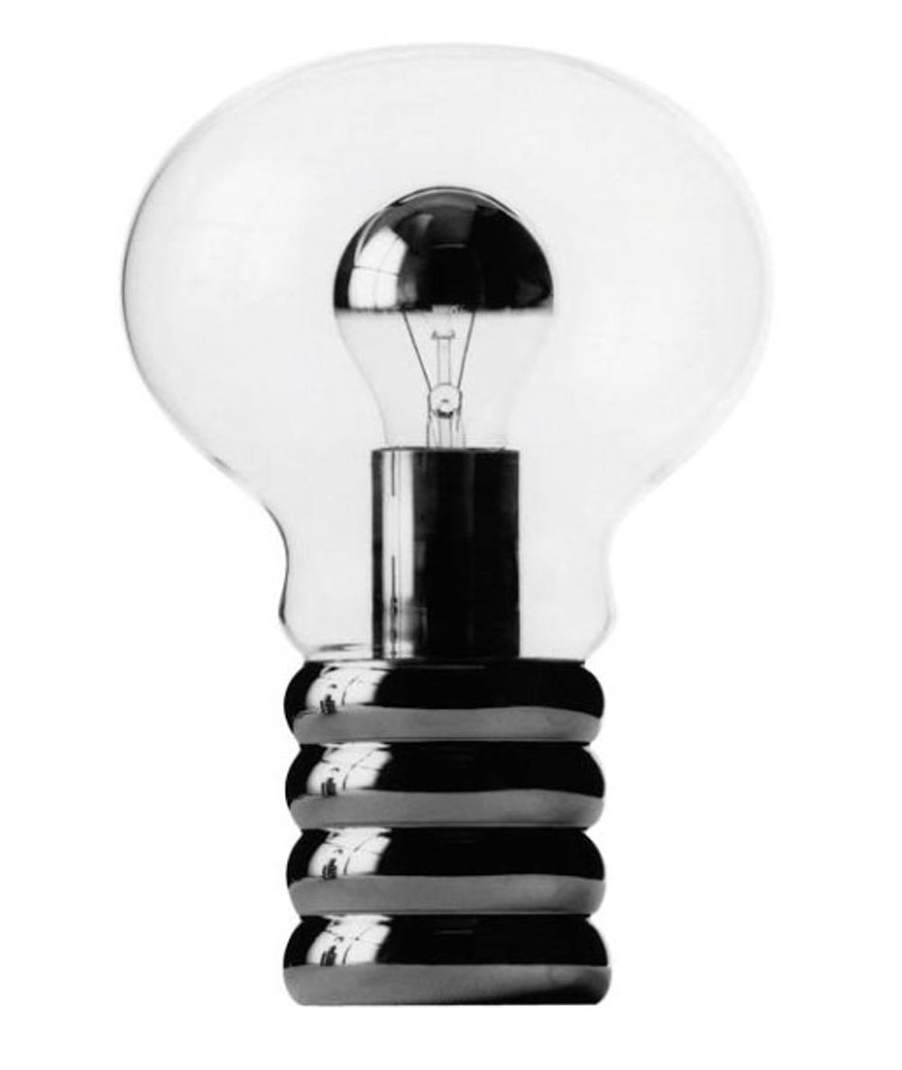Ingo Maurer's Bulb lampa stołowa składa się z reflektorowej żarówki zamontowanej w chromowanej podstawie z dmuchanym kryształowym kloszem.