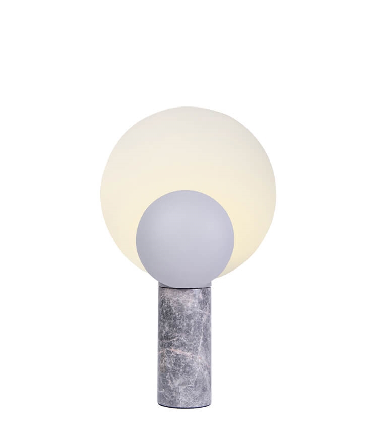 Caché lampa stołowa ma fascynujący i przyciągający wzrok design. Lampa składa się z dwóch okrągłych kloszy, które elegancko łączą się z solidną marmurową podstawą. Caché tworzy interesującą i zabawną atmosferę, gdzie światło odbija się tam i z powrotem między dwoma odcieniami.