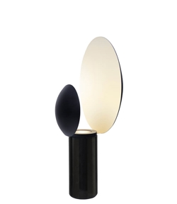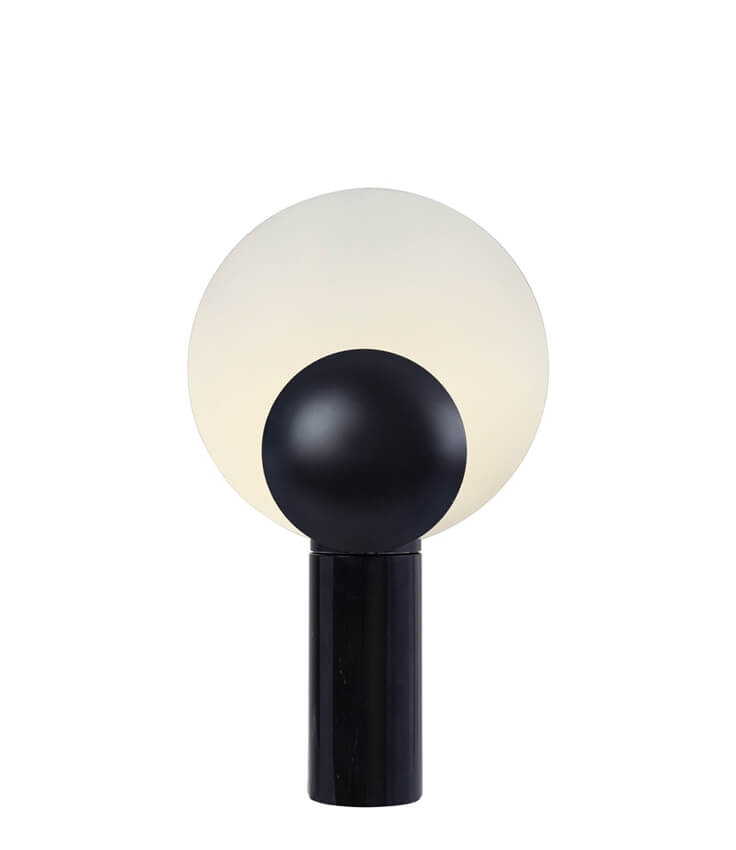 Caché lampa stołowa ma fascynujący i przyciągający wzrok design. Lampa składa się z dwóch okrągłych kloszy, które elegancko łączą się z solidną marmurową podstawą. Caché tworzy interesującą i zabawną atmosferę, gdzie światło odbija się tam i z powrotem między dwoma odcieniami.