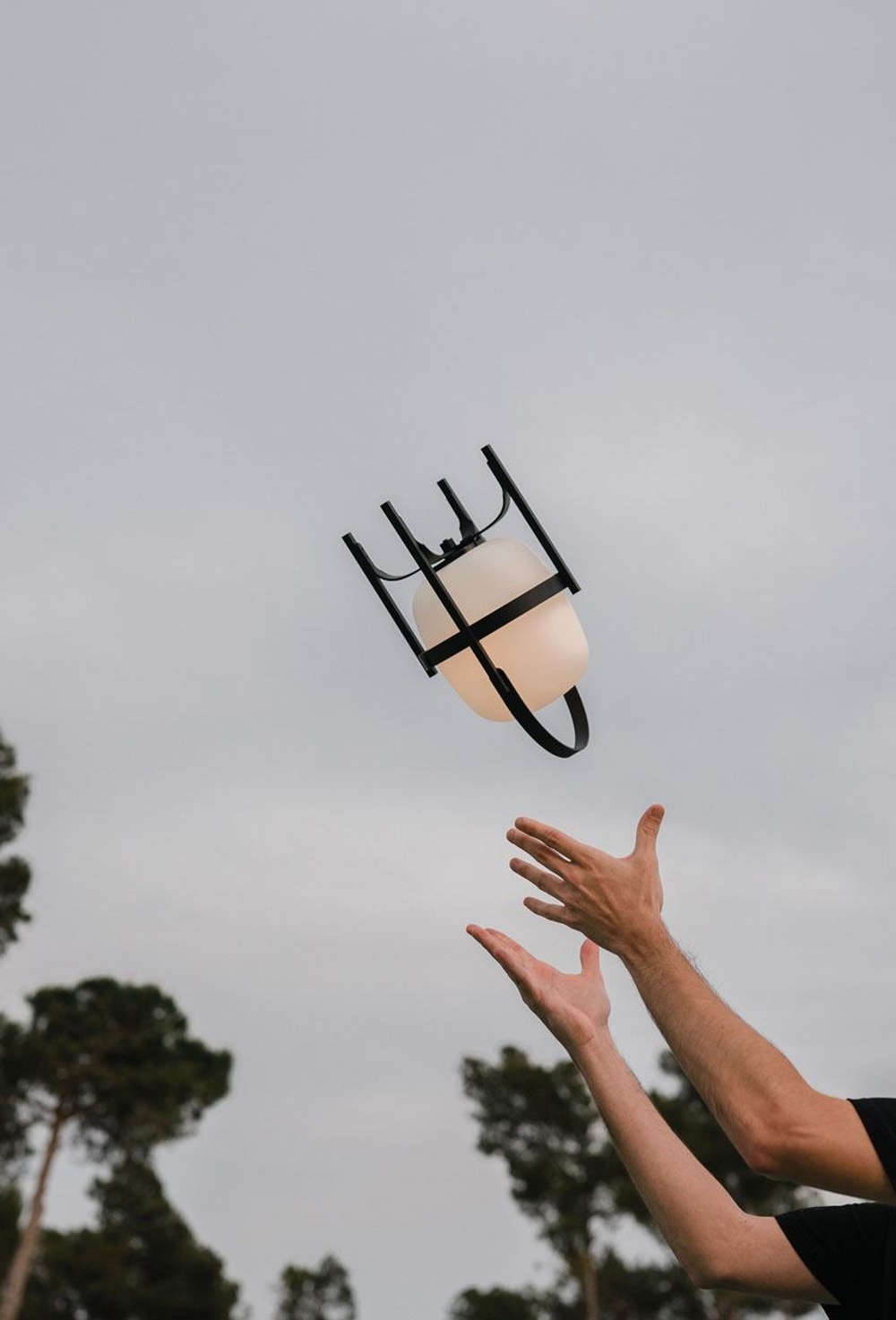 Cestita Alubat lampa bateryjna od Santa & Cole to przenośna i bezprzewodowa lampa z aluminium z białym kloszem z polietylenu.