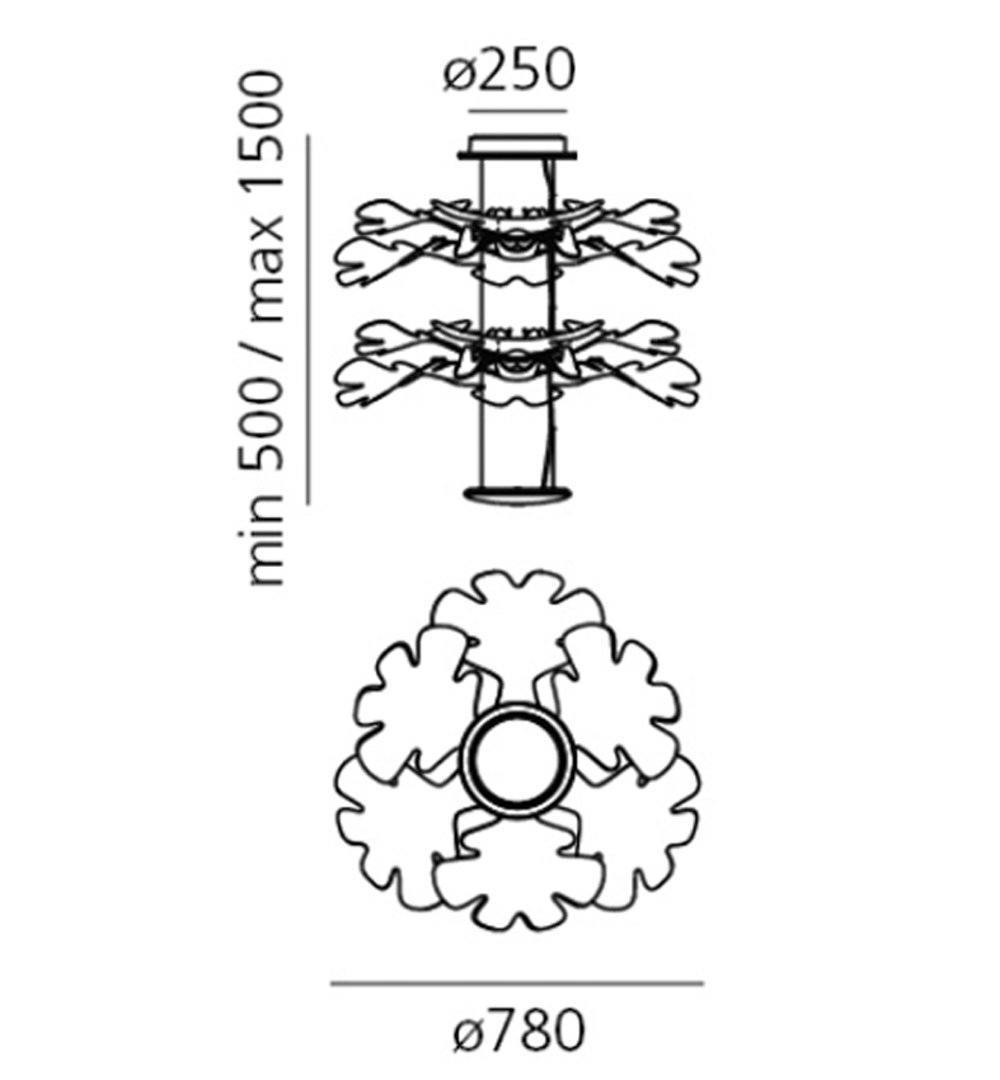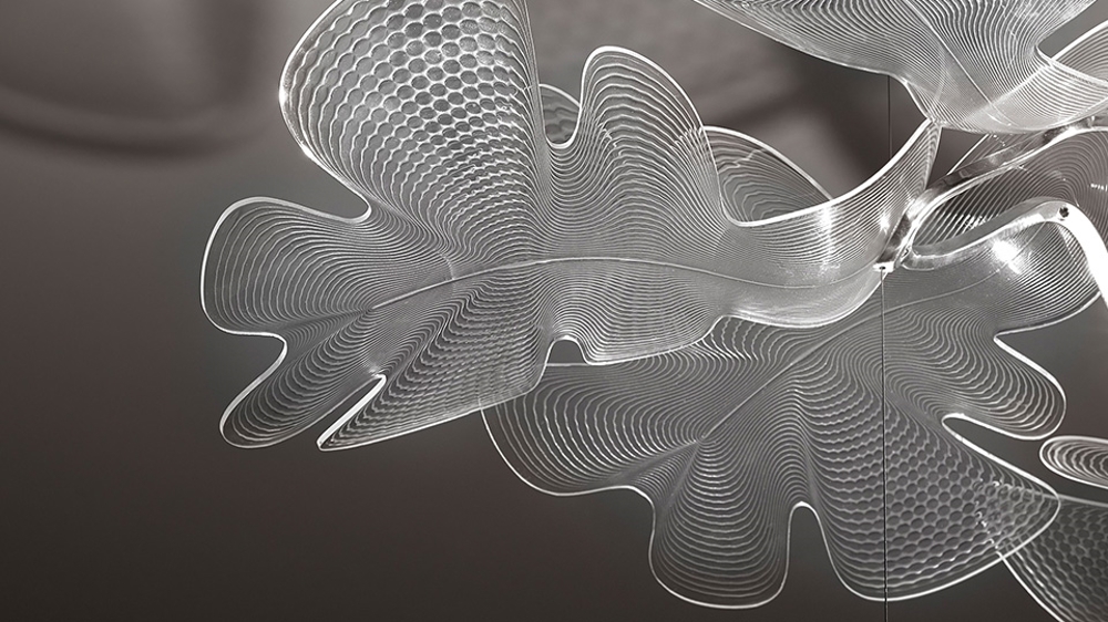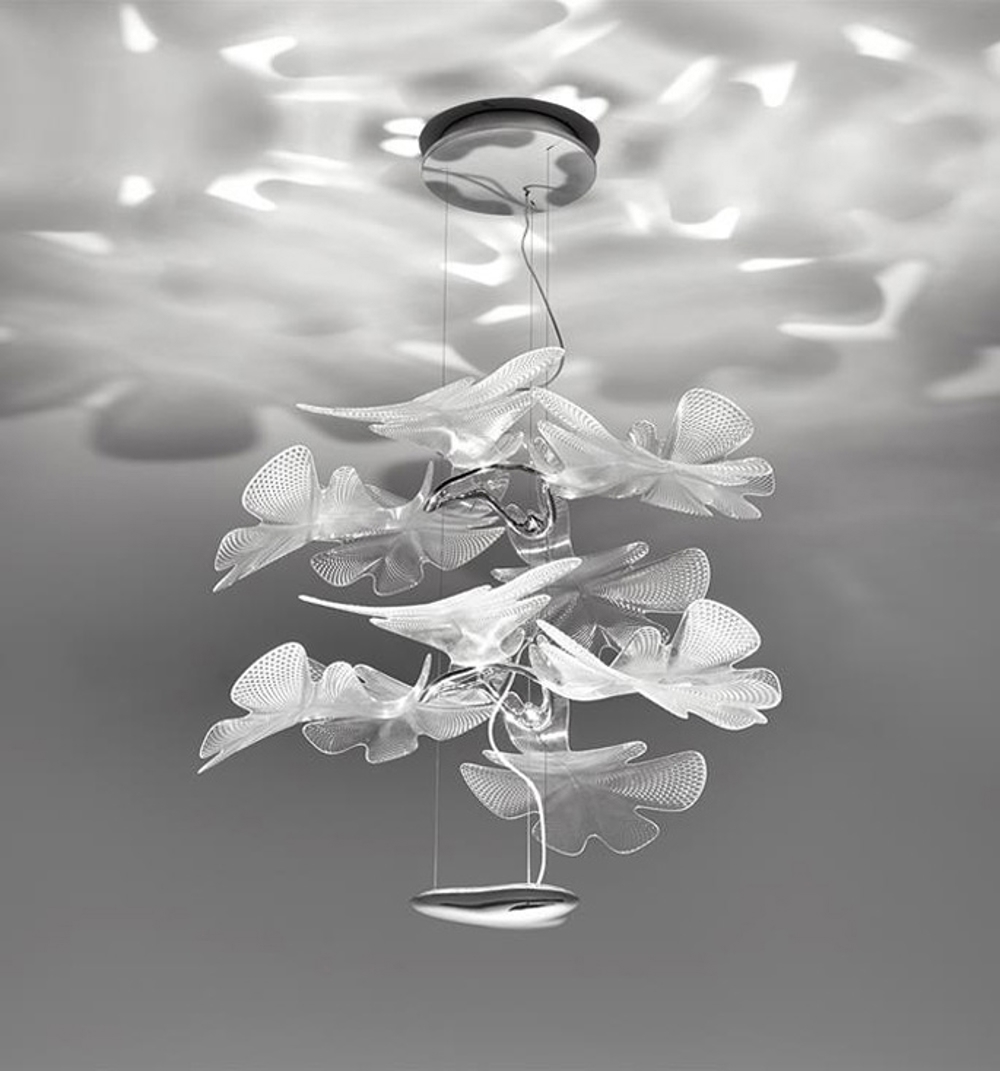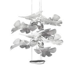 Piękna lampa wisząca z aluminiową ramą i przezroczystymi plastikowymi liśćmi. Lampa podkreśla zarówno niezwykłe umiejętności Artemide, jak i Rossa Lovegrove'a w projektowaniu oświetlenia, które jest innowacyjne i organiczne w formie.