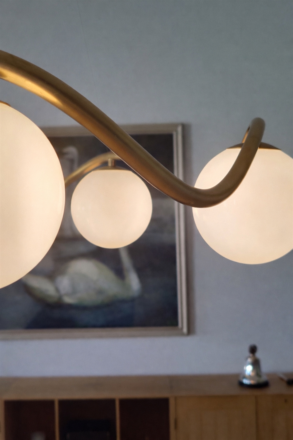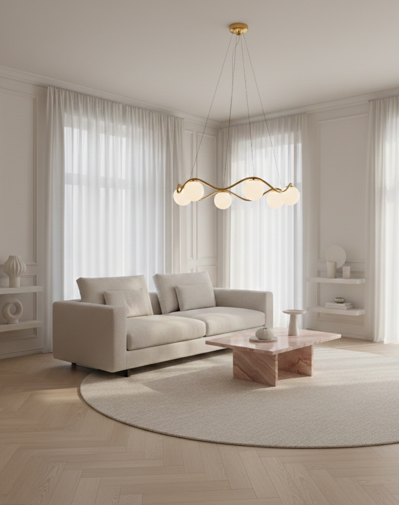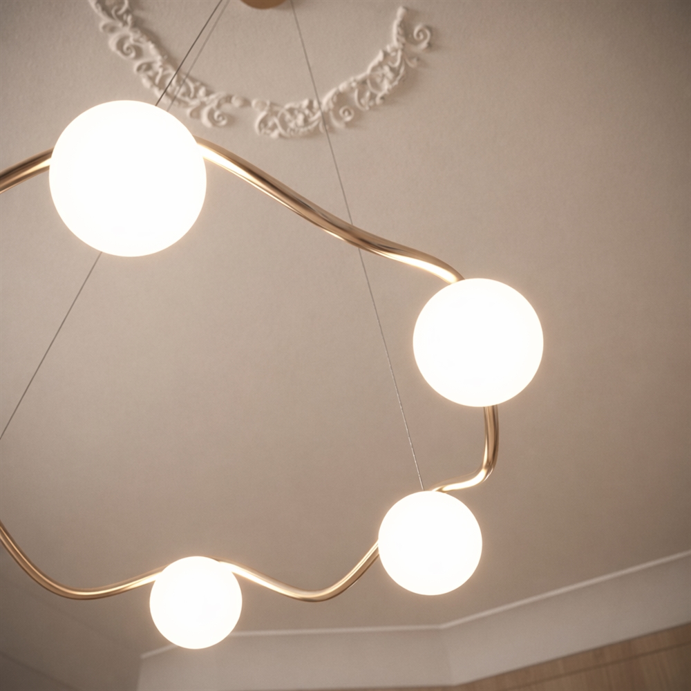 Żyrandol Circle of Life to wyrafinowany skandynawski minimalizm o eleganckim charakterze, inspirowany wzlotami i upadkami życia. Rzeźbiarska rama z ręcznie wykonanego, polerowanego mosiądzu ma organiczne krzywizny oraz sześć ręcznie dmuchanych, kulistych kloszy z opalowego szkła. Duży żyrandol emituje miękkie światło i świetnie sprawdzi się jako oświetlenie nad stołem jadalnianym lub jako centralny punkt w salonie, kuchni czy przedpokoju.
