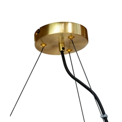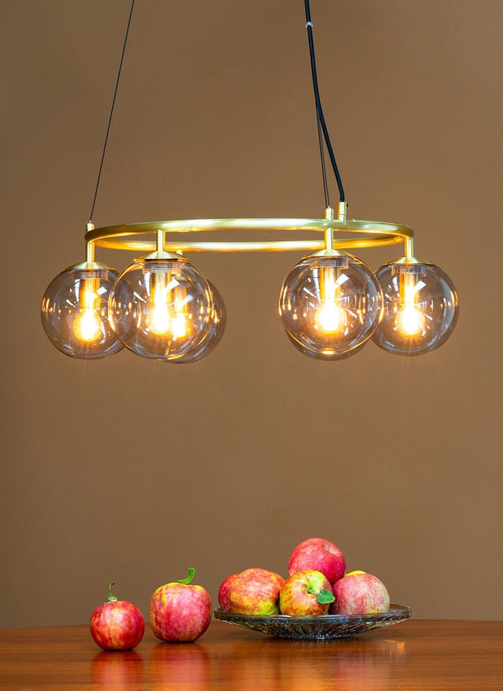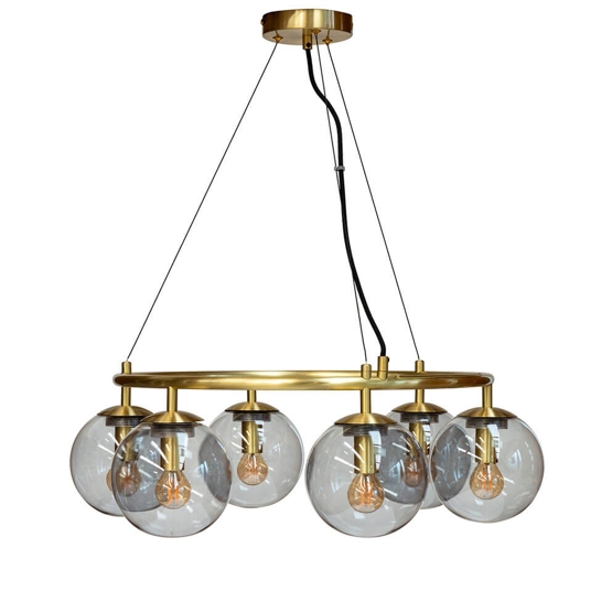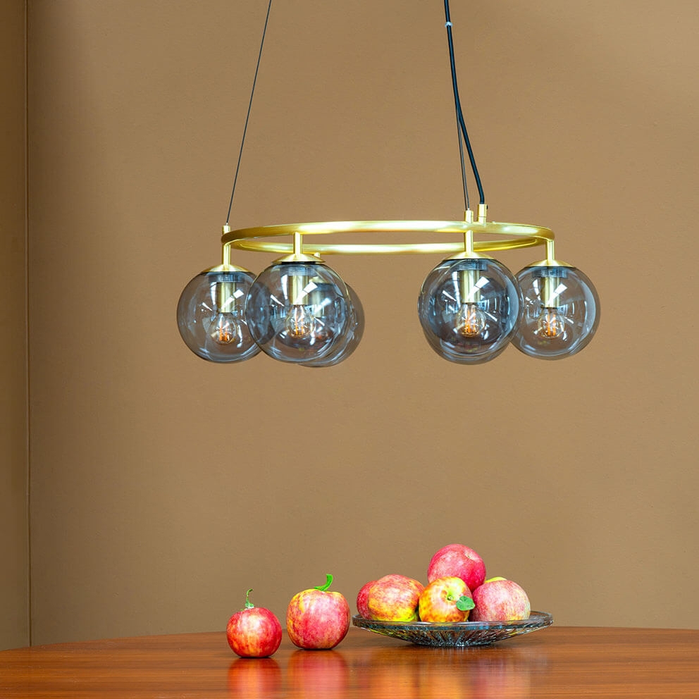 Como żyrandol z sześcioma szklanymi kloszami w odcieniu smoke i mosiężnym designem doskonale nadaje się jako oświetlenie nad stołem jadalnym. Żyrandol zapewnia przyjemne światło i jednocześnie jest wyrazistym elementem w Twoim wnętrzu. Lampa wisi na dołączonej rozecie z mosiądzu na trzech drutach, co nadaje jej stylowy i elegancki wygląd.