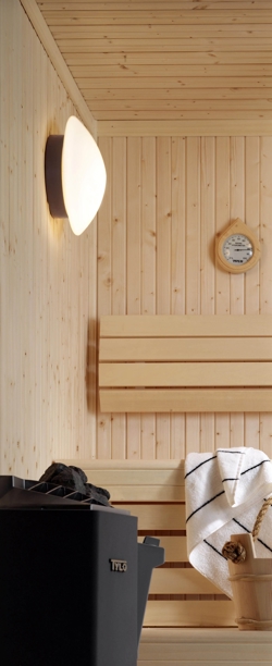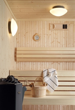 Solhem Sauna lampa saunowa dostępna jest w kolorach białym, szarym i brązowym. Seria Contrast obejmuje oprócz Solhem Sauna także Fridhem Sauna.