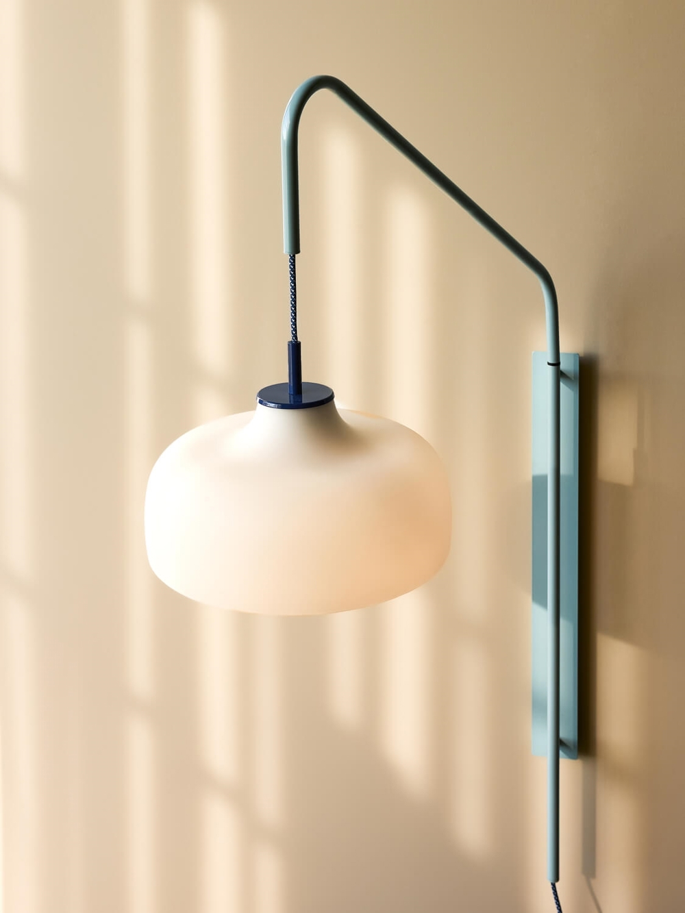 Current kinkiet składa się z niebieskiej podstawy i białego opalowego klosza wykonanego ze szkła.