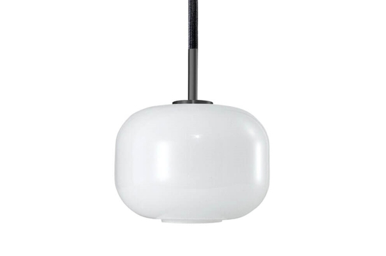 Piękna szklana lampa wisząca o miękkich, organicznych kształtach w stylowym, nordyckim i nowoczesnym designie. Mlecznobiałe, błyszczące szkło opalowe jest dmuchane ręcznie z rzemieślniczą precyzją i gustownie połączone z górą i baldachimem w kolorze titanium oraz czarnym tekstylnym przewodem. Lampa idealnie nadaje się jako lampa nad stół jadalniany nad mniejszy stół - lub użyj kilku nad większym stołem jadalnianym lub jako lampy kuchenne.
