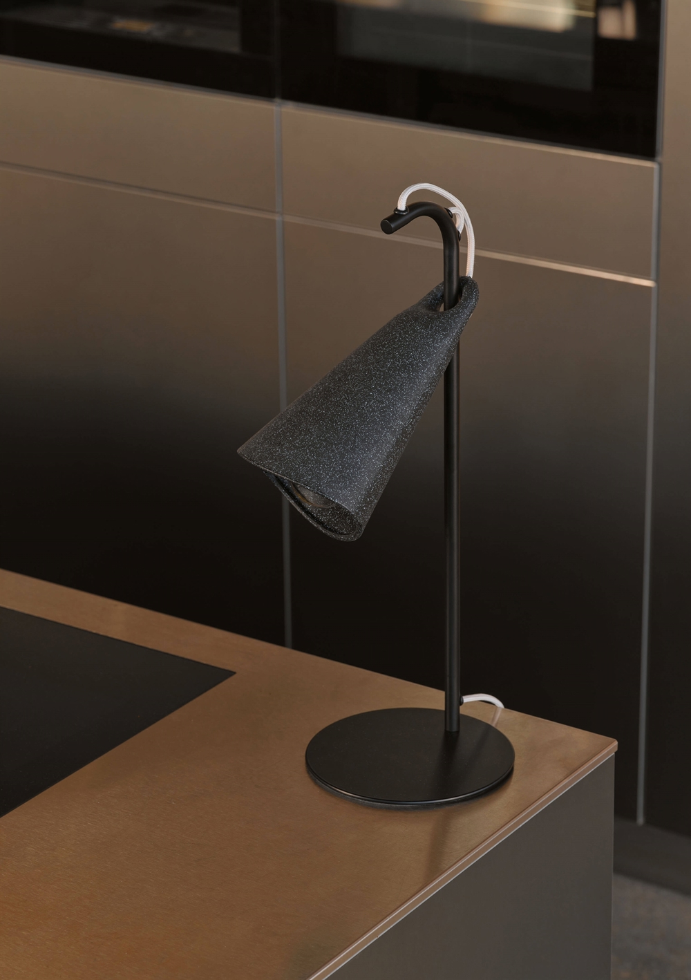 Ponadczasowa lampa stołowa Decor Bell w kolorze czarnym wykonana ze stali z kloszem z recyklingowanego polietylenu to doskonały wybór jako lampa na biurko, stolik nocny, półkę lub stolik boczny przy fotelu. Pozycja klosza może być zmieniana.