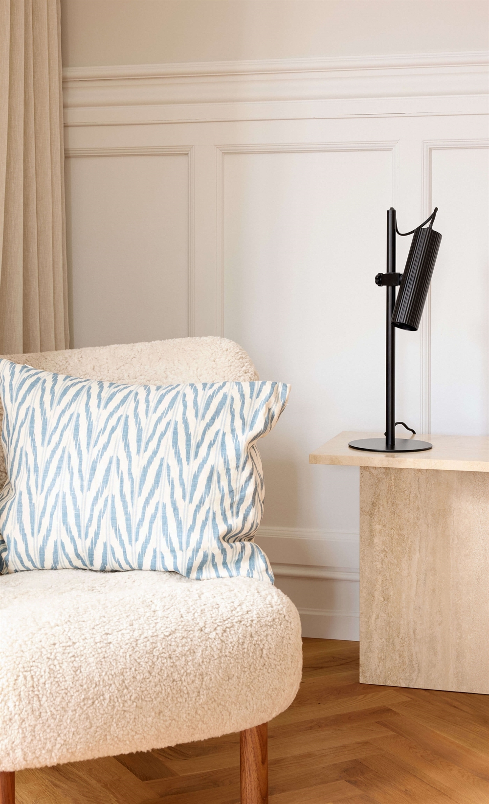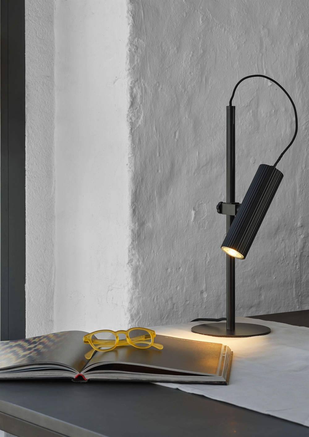 Lampa stołowa Decor Drums ze stali z matowym czarnym wykończeniem ma minimalistyczny design, który doskonale wpasuje się w wiele wnętrz. Żłobiony klosz to subtelny detal, który nadaje lampie wyrafinowany wygląd. Lampa umożliwia regulację kierunku światła i jest idealnym wyborem na biurko, stolik nocny lub półkę.