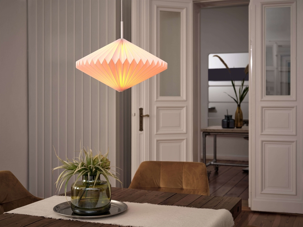 Lampa wisząca Decor Paper Lantern Diamond z cienkiego składnego papieru i stali emituje ciepłe i przyjemne światło. Użyj tej dekoracyjnej lampy w salonie i sypialni lub jako oświetlenie w pokoju dziecięcym, przedpokoju i korytarzu lub przy schodach.