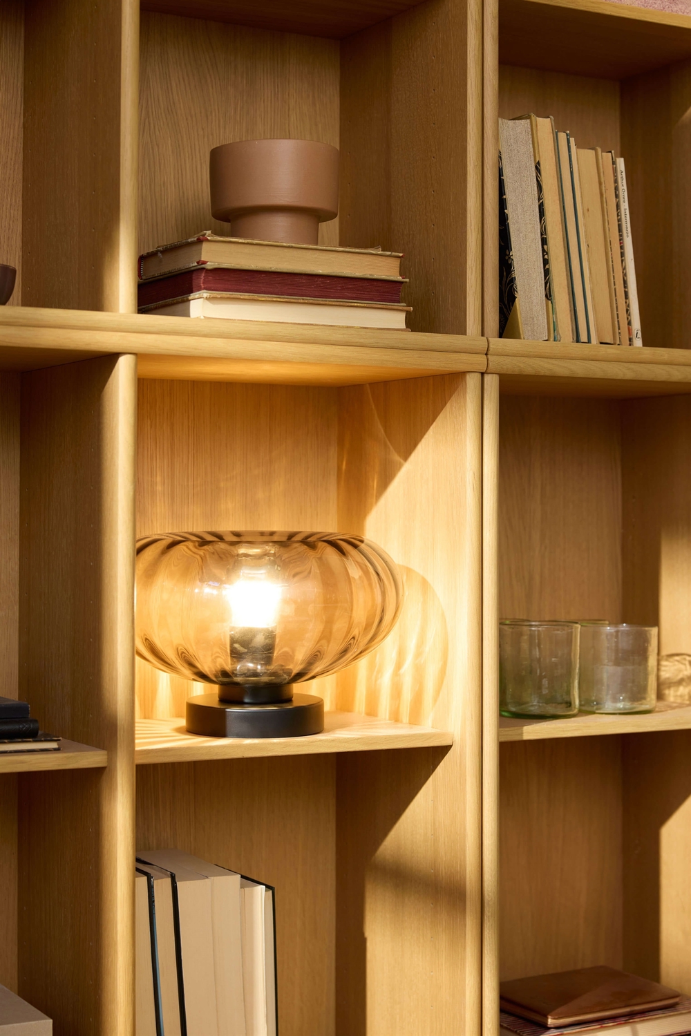 Lampa jest idealna na półkę lub stół w salonie, sypialni lub przedpokoju. Czarna stalowa podstawa podkreśla stylowy wygląd lampy i ułatwia jej integrację zarówno w nowoczesnych, jak i klasycznych wnętrzach. Oprawka E27 daje dużą swobodę w wyborze jasności i temperatury barwowej źródła światła.