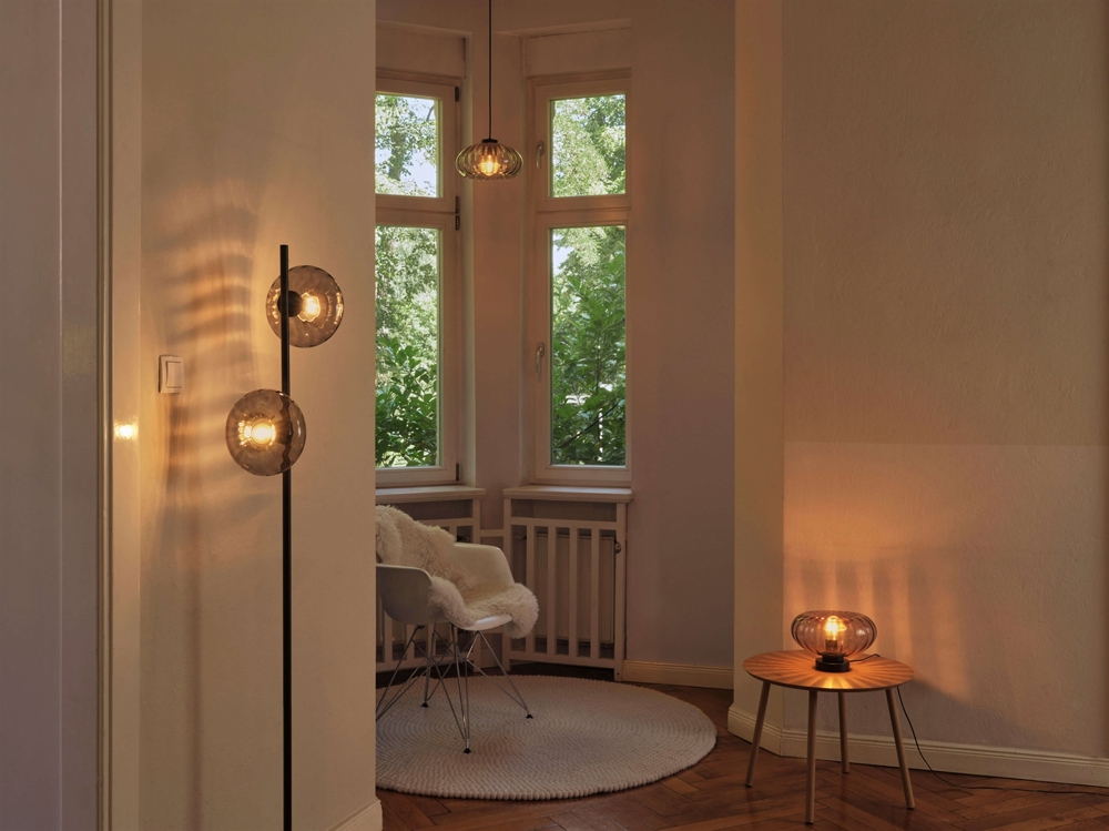 Decor Smoke Glass dostępna jest jako lampa wisząca, lampa stołowa i lampa podłogowa oraz jako kinkiet/lampa sufitowa. Stylowe lampy z tej serii zostały stworzone z myślą o designie, elastyczności i atmosferze i mogą być z powodzeniem łączone, aby stworzyć spójność w aranżacji wnętrza.