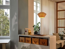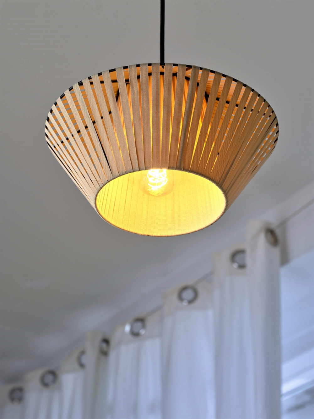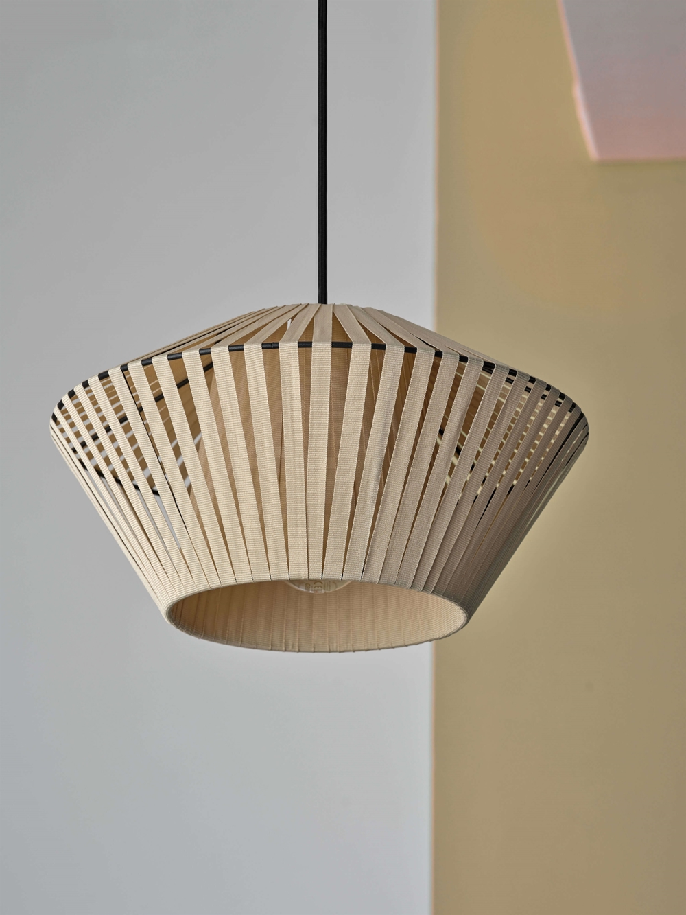 Pendel dostępny jest w dwóch rozmiarach, które można łączyć z innymi lampami z serii Decor Stripes, aby stworzyć spójność w aranżacji wnętrza. Seria lamp dostępna jest w kolorze beżowym lub ciemnoszarym.