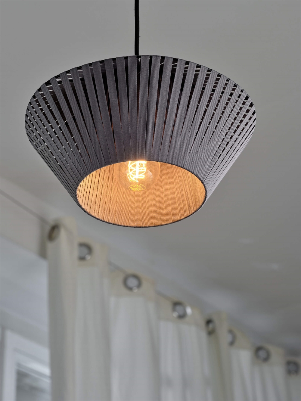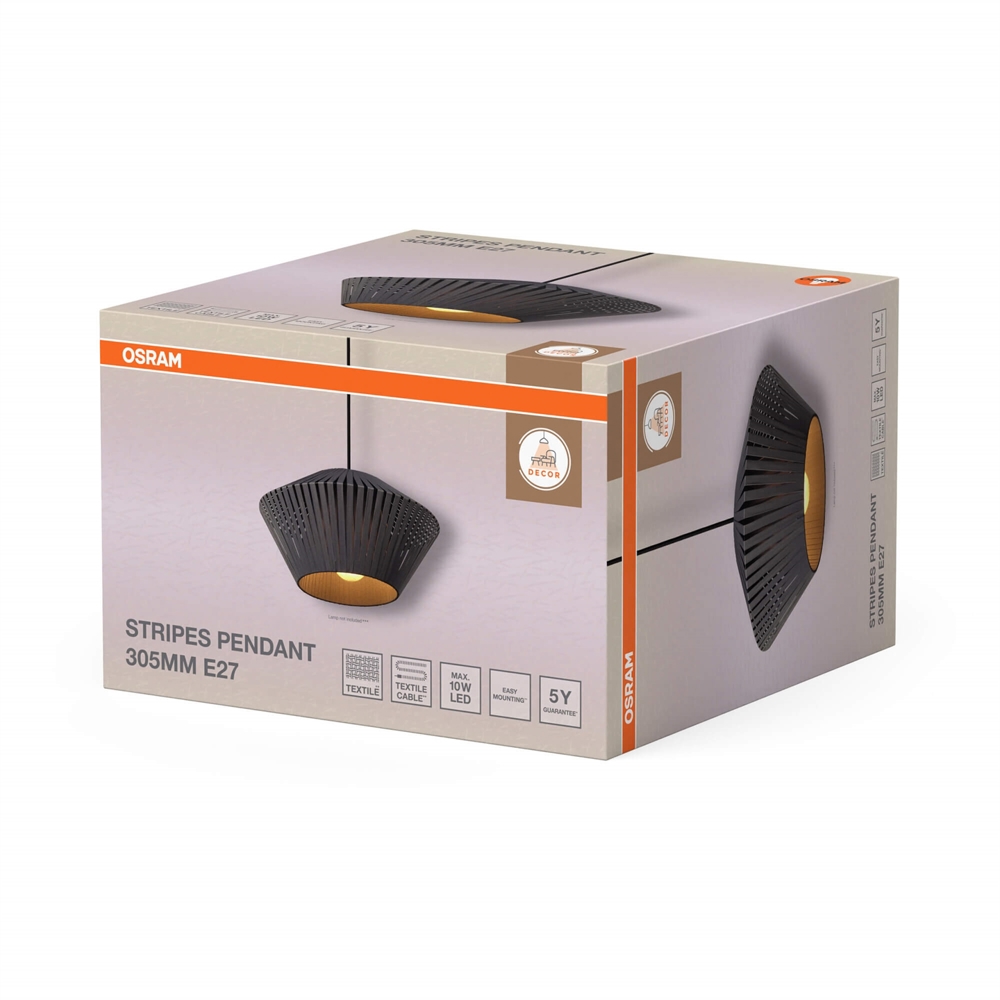 Pendel dostępny jest w dwóch rozmiarach, które można łączyć z innymi lampami z serii Decor Stripes, aby stworzyć spójność w aranżacji wnętrza. Seria lamp dostępna jest w kolorze beżowym lub ciemnoszarym.