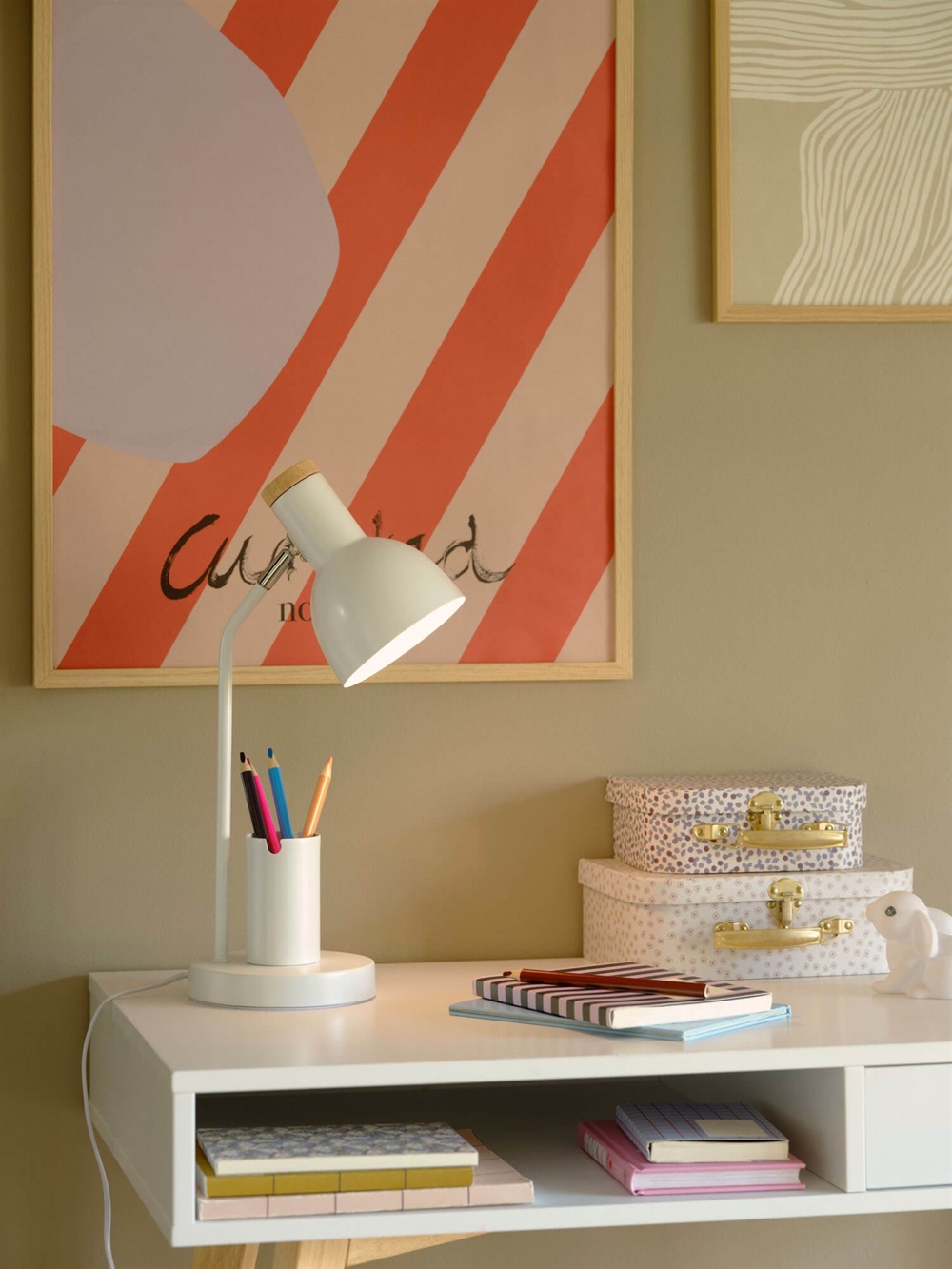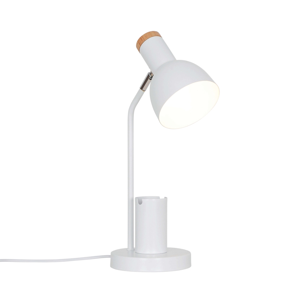 Lampa stołowa Devone z wbudowanym miejscem na ołówki lub uchwytem na telefon to idealna lampa biurkowa do pokoju dziecięcego. Dzięki połączeniu metalu i drewna z certyfikatem FSC, Devone ma elegancki design z elastyczną głowicą lampy, którą można przechylać o 150° i obracać o 320°. Funkcjonalna i praktyczna lampa na biurko z dobrym światłem do czytania i sprytnymi detalami.