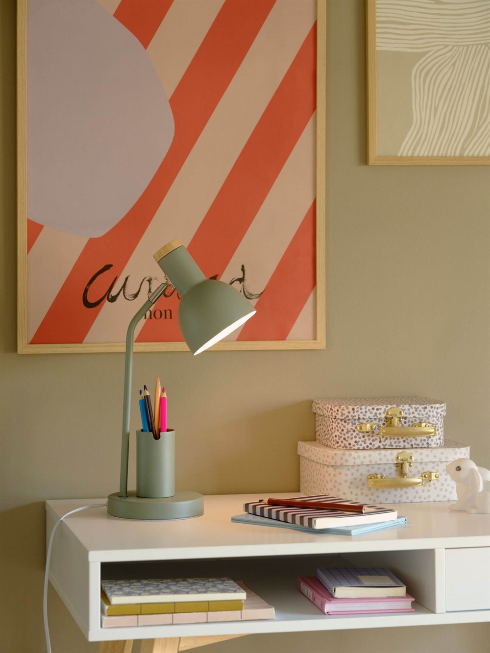 Lampa stołowa Devone z wbudowanym miejscem na ołówki lub uchwytem na telefon to idealna lampa biurkowa do pokoju dziecięcego. Dzięki świetnemu połączeniu metalu i drewna z certyfikatem FSC, Devone ma elegancki design z elastyczną głowicą lampy, którą można przechylać o 150° i obracać o 320°. Funkcjonalna i praktyczna lampa na biurko z dobrym światłem do czytania i sprytnymi detalami.