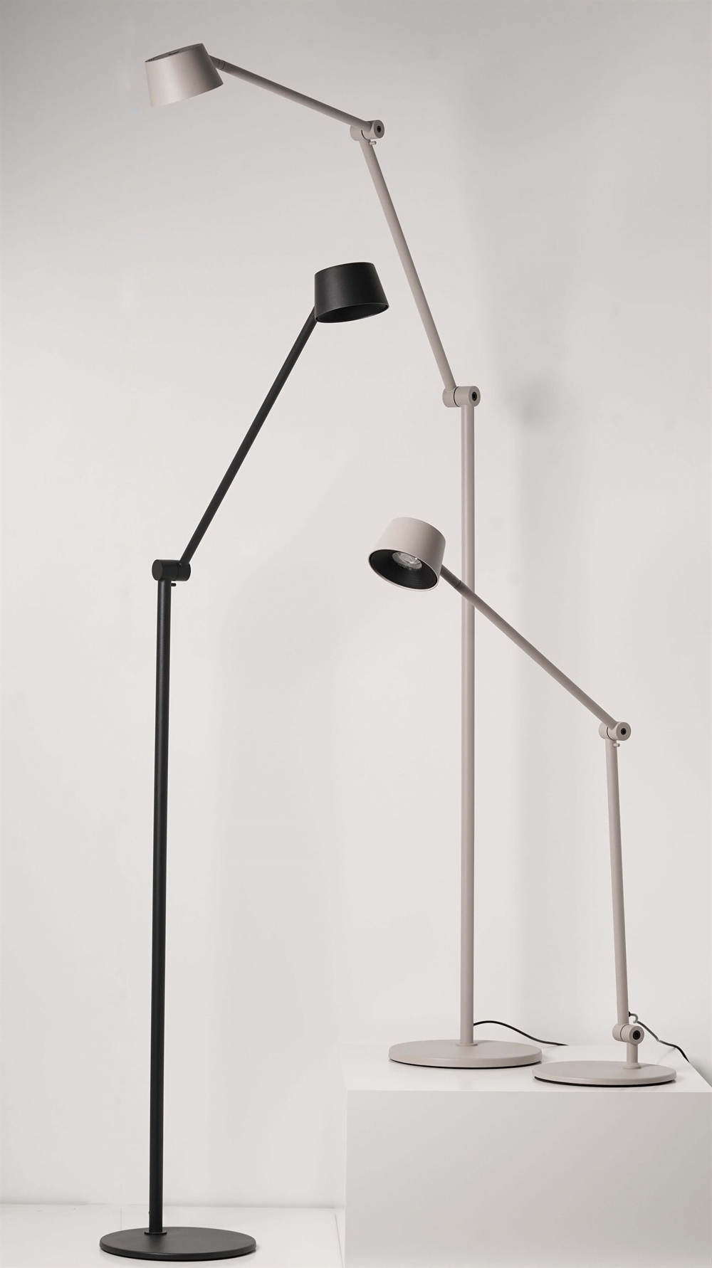 Surowa forma z dyskretnymi, przemyślanymi detalami ma industrialny charakter, podkreślony przez widoczne przeguby i smukłą głowicę.
