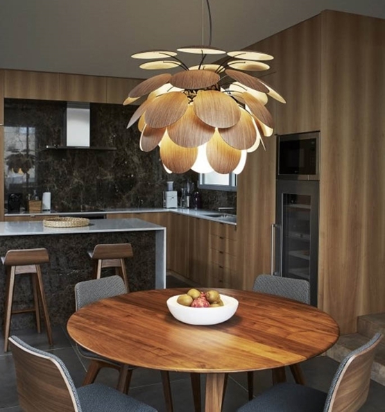 Lampa wisząca Discoco to dekoracyjna i elegancka lampa. Składa się z 35 krążków z drewna dębowego, co nadaje jej rustykalny i piękny wygląd.