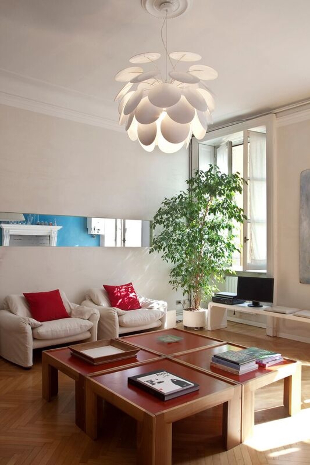 Lampa Discoco składa się z 35 okrągłych dysków z tworzywa ABS, które przypominają liście. Ten design nadaje lampie bardzo lekki wygląd, co czyni ją bardzo elegancką.