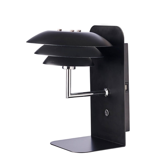 DL20 kinkiet w czarnym kolorze z małą półką z wbudowanym USB jest idealny do przechowywania telefonu podczas ładowania. Ta wersja DL20 doskonale sprawdzi się jako lampa i stolik nocny w sypialni. Kinkiet posiada trzy czarne metalowe klosze w różnych rozmiarach, które zapewniają przytulne światło bez oślepiania. Czarne klosze nadają lampie elegancki wygląd, który wzbogaca wystrój Twojego domu.