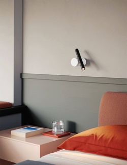 Kinkiet i lampa sufitowa Doi składa się z eleganckiej podstawy i reflektora LED w formie cylindrycznego klosza o długości 18 cm. Podstawa i klosz są połączone mechanicznym przegubem, dzięki czemu światło można obracać i kierować zarówno w górę, jak i w dół.