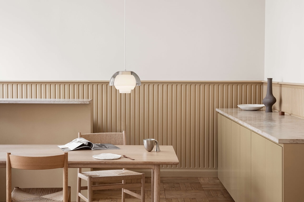 Ergo to wielowarstwowy pendel, który składa się z trójwarstwowego opalowego rdzenia szklanego z kolorowym kloszem szklanym wokół w kolorze szarym lub piaskowym. Klosz lampy sprawia, że pendel zapewnia miękkie oświetlenie otoczenia, jednocześnie emitując subtelne, przyjemne światło skierowane w dół. Ergo łączy więc komfortowe oświetlenie skierowane w dół z oświetleniem otoczenia. Po włączeniu, rdzeń świeci miękkim białym światłem, podczas gdy zewnętrzny klosz szklany przyjmuje przyjemną ciepłą aurę. Im ciemniejsze jest pomieszczenie, tym bardziej magiczny staje się efekt.