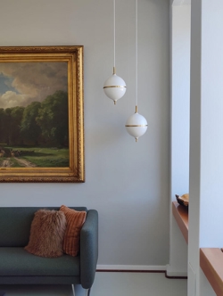 Projekt jest ręcznie wykonany z mosiądzu i opalowego szkła, stanowiąc ponadczasowe połączenie skandynawskiego minimalizmu i nowoczesnej elegancji. Biały przewód materiałowy w tej wersji podkreśla jasny i harmonijny wyraz lampy. Idealny wybór do mniejszych pomieszczeń lub jako oświetlenie w grupie nad stołem jadalnym.