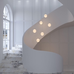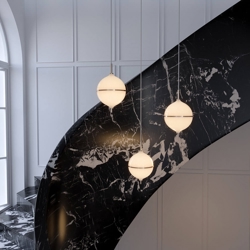 Lampa wisząca Eternal Moonlight jest inspirowana mistyką księżyca i dodaje wyrafinowanego akcentu do wnętrza. Kulisty klosz z dmuchanego opalowego szkła rozprasza miękkie światło i jest podzielony subtelnym mosiężnym paskiem, symbolizującym półksiężyc.