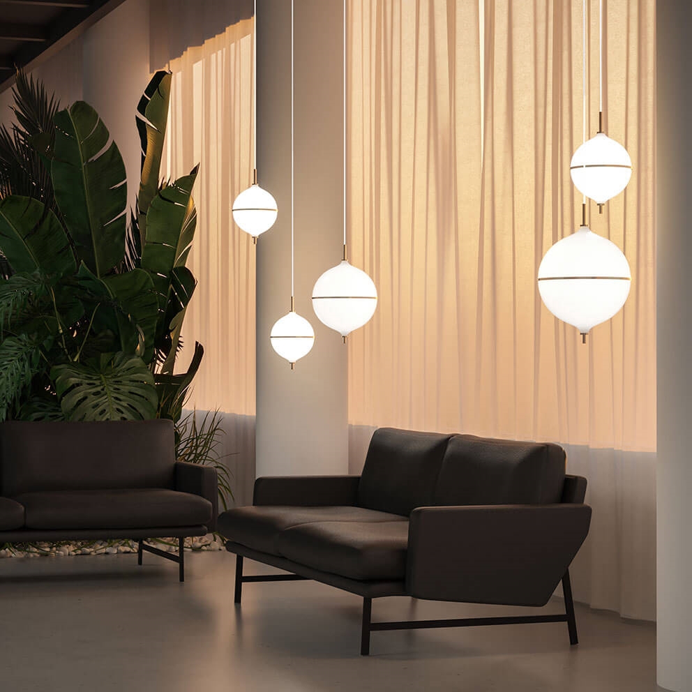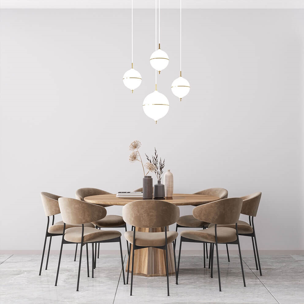 Projekt jest ręcznie wykonany z mosiądzu i opalowego szkła, stanowiąc ponadczasowe połączenie skandynawskiego minimalizmu i nowoczesnej elegancji, gdzie biały przewód materiałowy podkreśla jasny i harmonijny wyraz pendla. Idealny wybór jako oświetlenie nad stołem jadalnym.