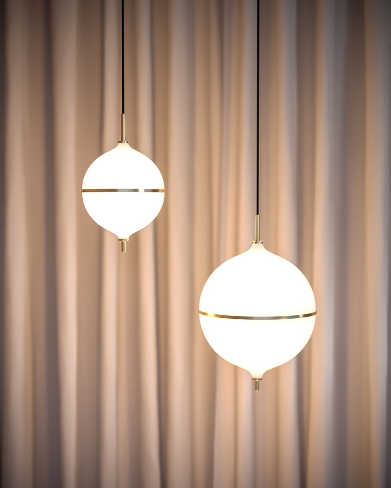 Pendel Eternal Moonlight jest inspirowany mistyką księżyca i dodaje wyrafinowanego akcentu do wnętrza. Kulisty klosz z dmuchanego opalowego szkła rozprasza miękkie światło i jest podzielony subtelnym mosiężnym paskiem, który symbolizuje półksiężyc.