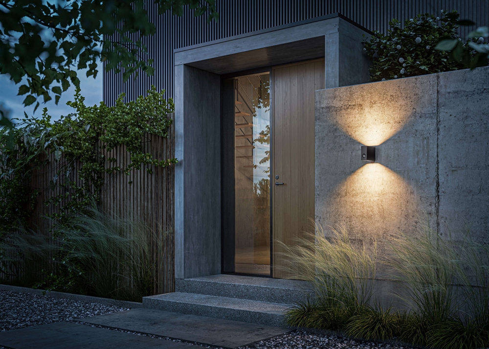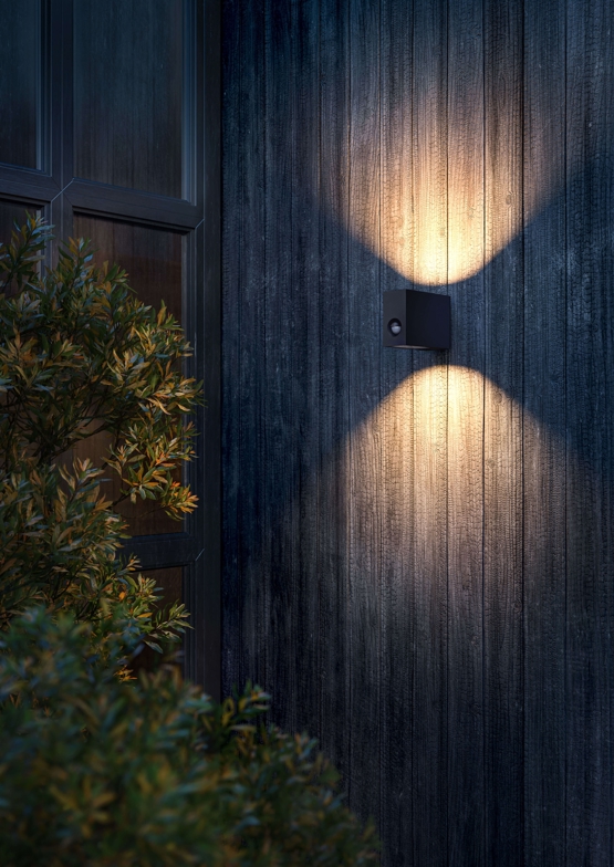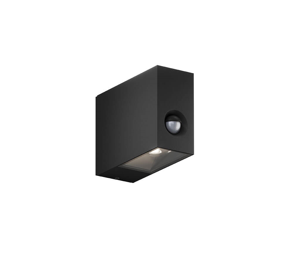 Eye Control z malowanego proszkowo odlewanego aluminium to elegancka zewnętrzna lampa z czujnikiem ruchu z dobrym oświetleniem skierowanym zarówno w górę, jak i w dół. Funkcjonalna zewnętrzna lampa ścienna w kolorze czarnym jest jedną z wersji od IP44.de z wykończeniem w jakości przybrzeżnej, co czyni ją wyjątkowo odporną na korozję. Trwałość została przetestowana w laboratorium za pomocą testu natryskowego z roztworem soli.