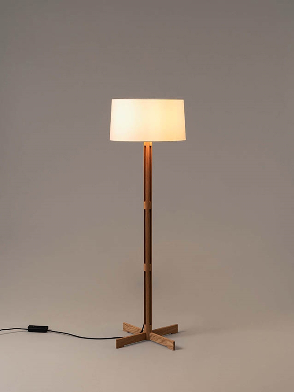 Lampa podłogowa Fad Fija ma solidną strukturę z dębu, cylindryczny kształt, przekrój i biały lniany abażur.