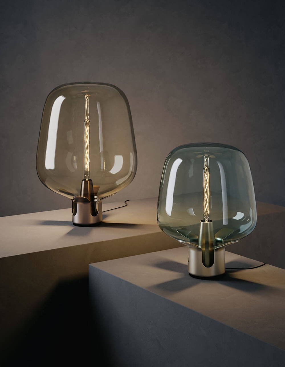 Flar dostępny jest w dwóch rozmiarach: medium i large, o wysokości odpowiednio 47 cm i 62,5 cm. Podstawa ma wykończenie w kolorach terra lub pearl, podczas gdy klosz jest w kolorze miodowym lub turkusowym.