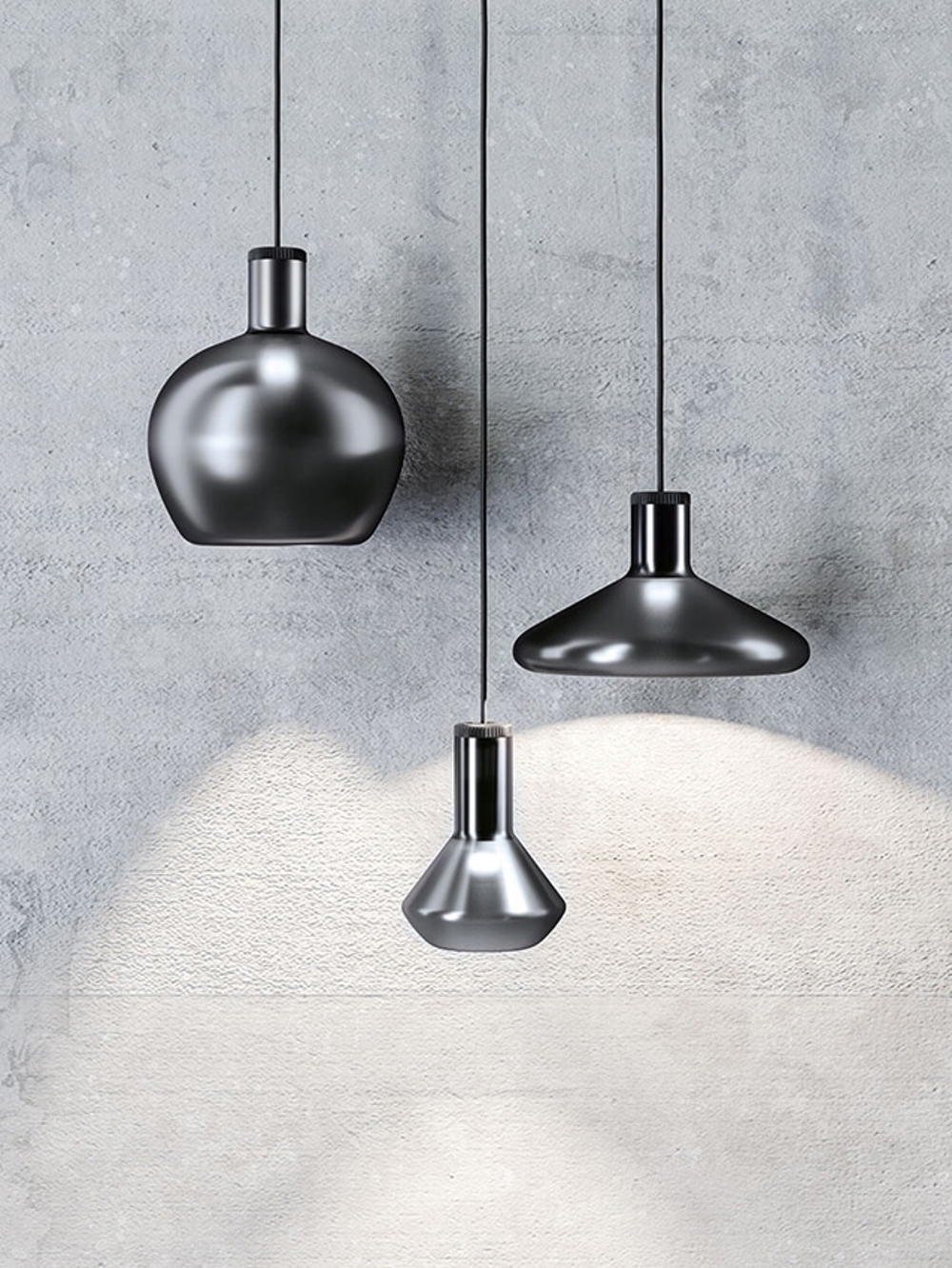 Lampa wisząca Flask dostępna jest w kolorze czarnym i mineralnym piasku (miedź) oraz w trzech różnych kształtach/rozmiarach.