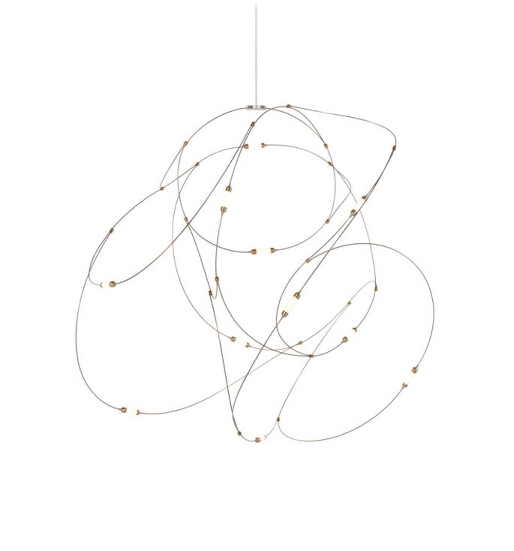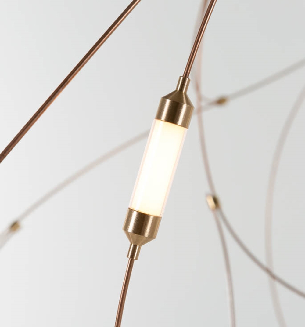 Wyjątkowa lampa wisząca Flock of Light zmienia się z lekkiej, artystycznej rzeźby designerskiej w ciągu dnia w rój wyrazistych, ciepłych świateł wieczorem. Rój świateł w ciszy.