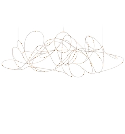 Wyjątkowa lampa wisząca Flock of Light zmienia się z lekkiej, artystycznej rzeźby designerskiej w ciągu dnia w rój wyrazistych, ciepłych świateł wieczorem. Rój świateł w ciszy.